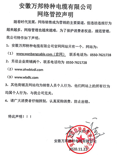 鄭重聲明:安徽萬邦特種電纜有限公司官方網站為:www_wanbangcable_com.ynshgc.cn,除此之外無任何子網站或合作網站,其余均為假冒偽劣。電話:0550-7621728 13485756353 地 址:安徽省天長市滁州高新技術產業開發區經四路29號